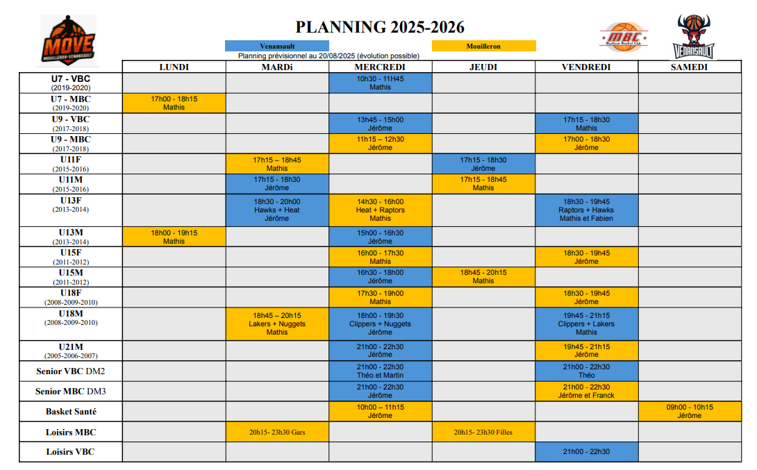 PLANNING DES ENTRAINEMENTS CTC MOVE SAISON 2025/2026